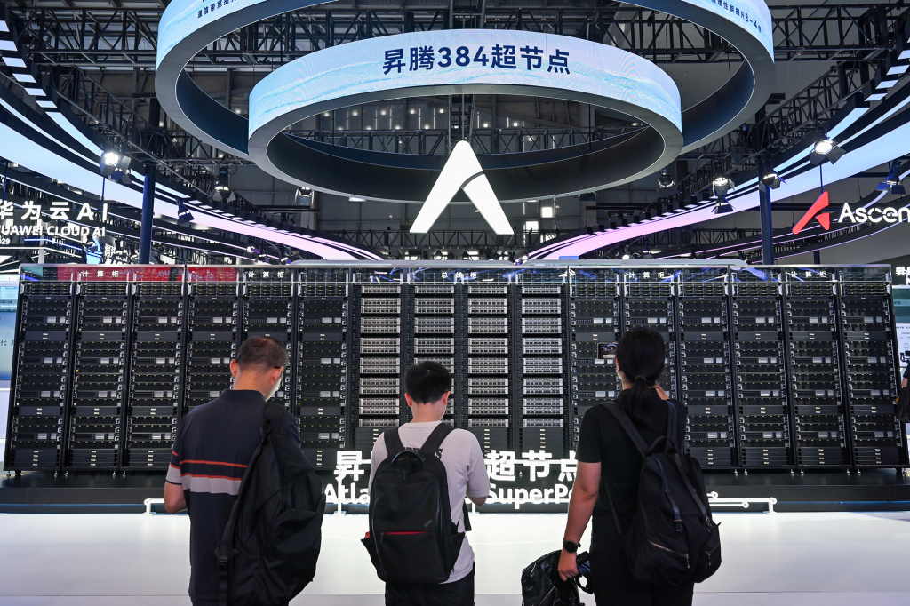 2025年7月26日,上海世博展覽館,華為昇騰超節點技術突破384卡高速互聯,通信帶寬提升15倍,使千億級模型性能提升2.5倍以上。澎湃新聞記者 朱偉輝 圖